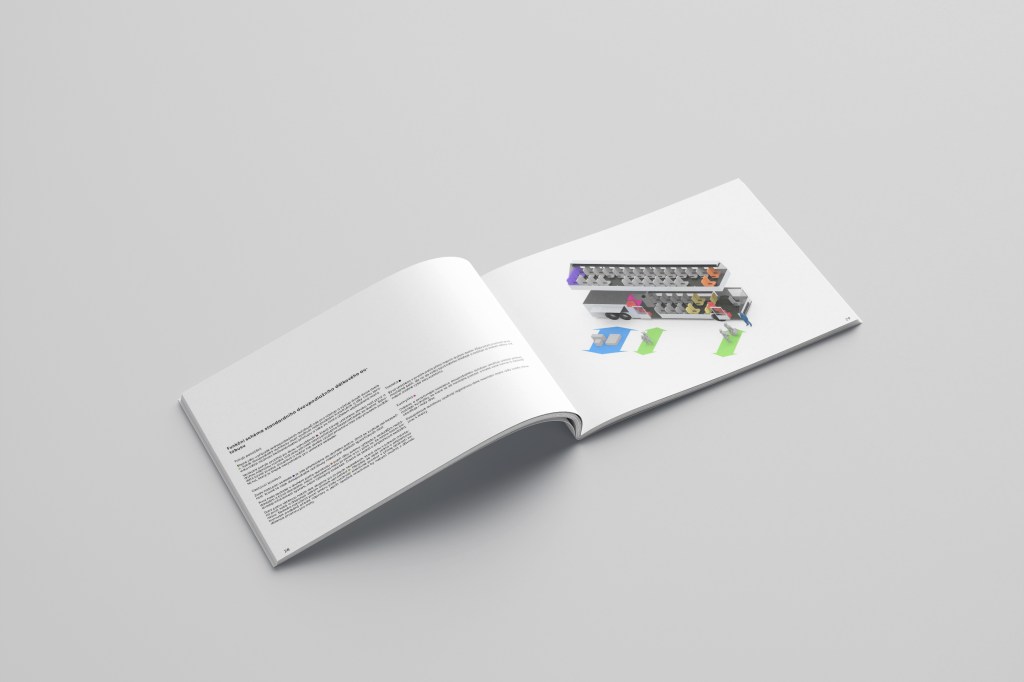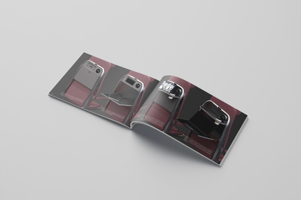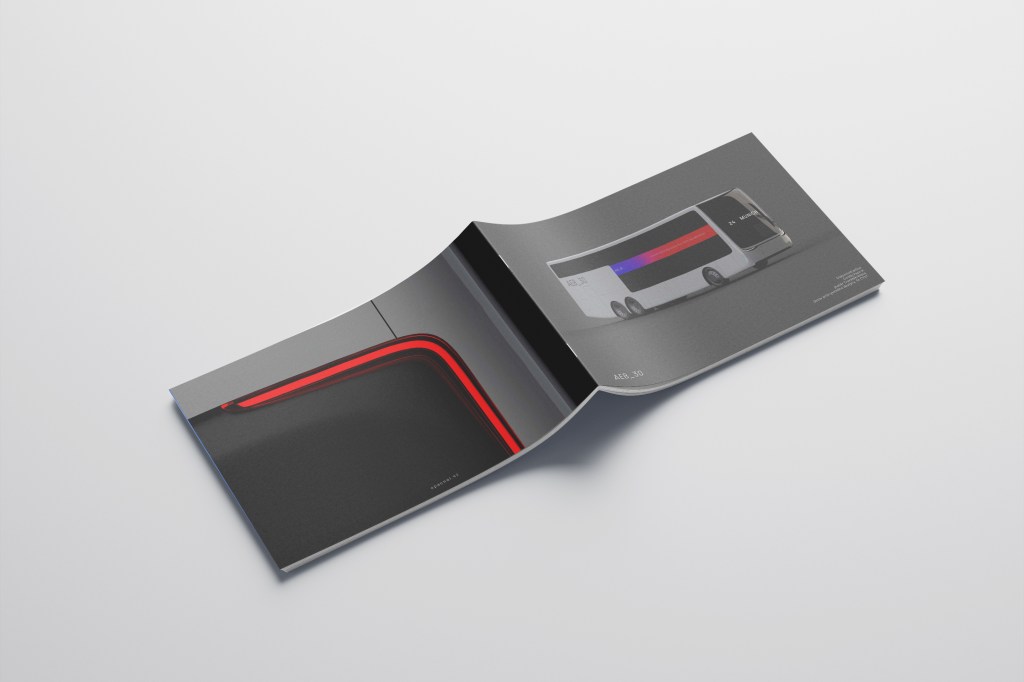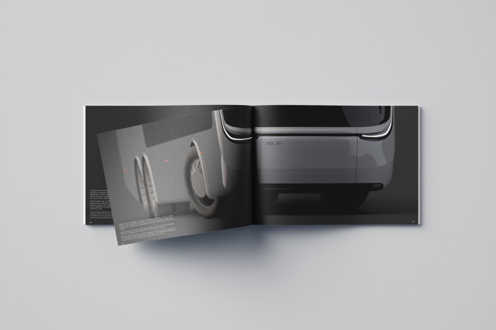 Portfolio for my AEB_30 diploma thesis. Minimal graphic layout with a lot of spare space and schematic explanatory illustrations for easy understandability and nice reading experience. Big rendering across adjacent A3 pages make an impress and are a perfect match with the bus and its oblong proportions.