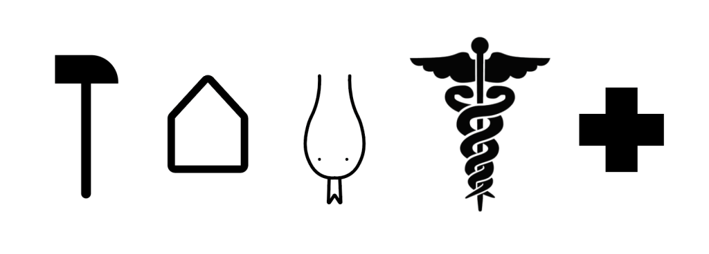 The main shape represents hammer as an old and well-known symbol of construction works, but its handle is short and forked. This stands for the tongue of the snake which slinks along the stick of Aesculapius in the oldest medicinal symbol. Also, it slightly reminds the simple symbol of a house. By the symmetry and balance, the whole shape of the logo reminds of a medical isosceles cross.