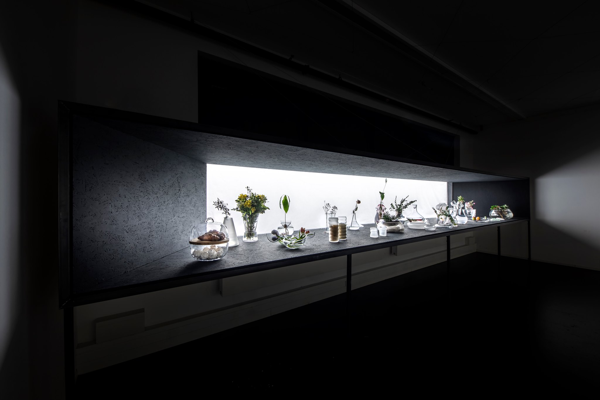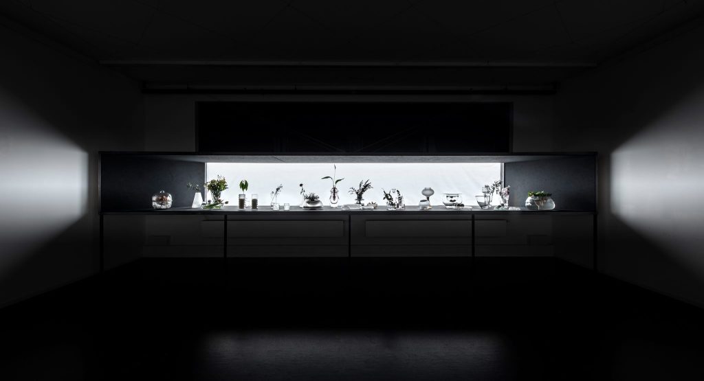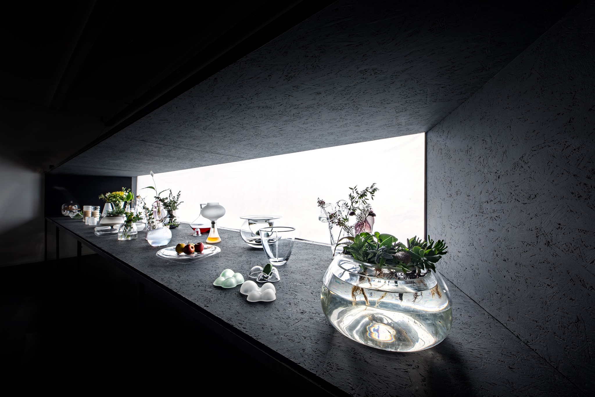 Presentation of the semestral projects made in our studio led by Filip Streit and Tomáš Polák. It highlights the glass objects and hides disturbing surroundings in a shadow. It draws the visitors in and attracts everyone’s attention. The emphasis is laid on the daylight and the backlight points out the qualities and shapes of the glass objects.