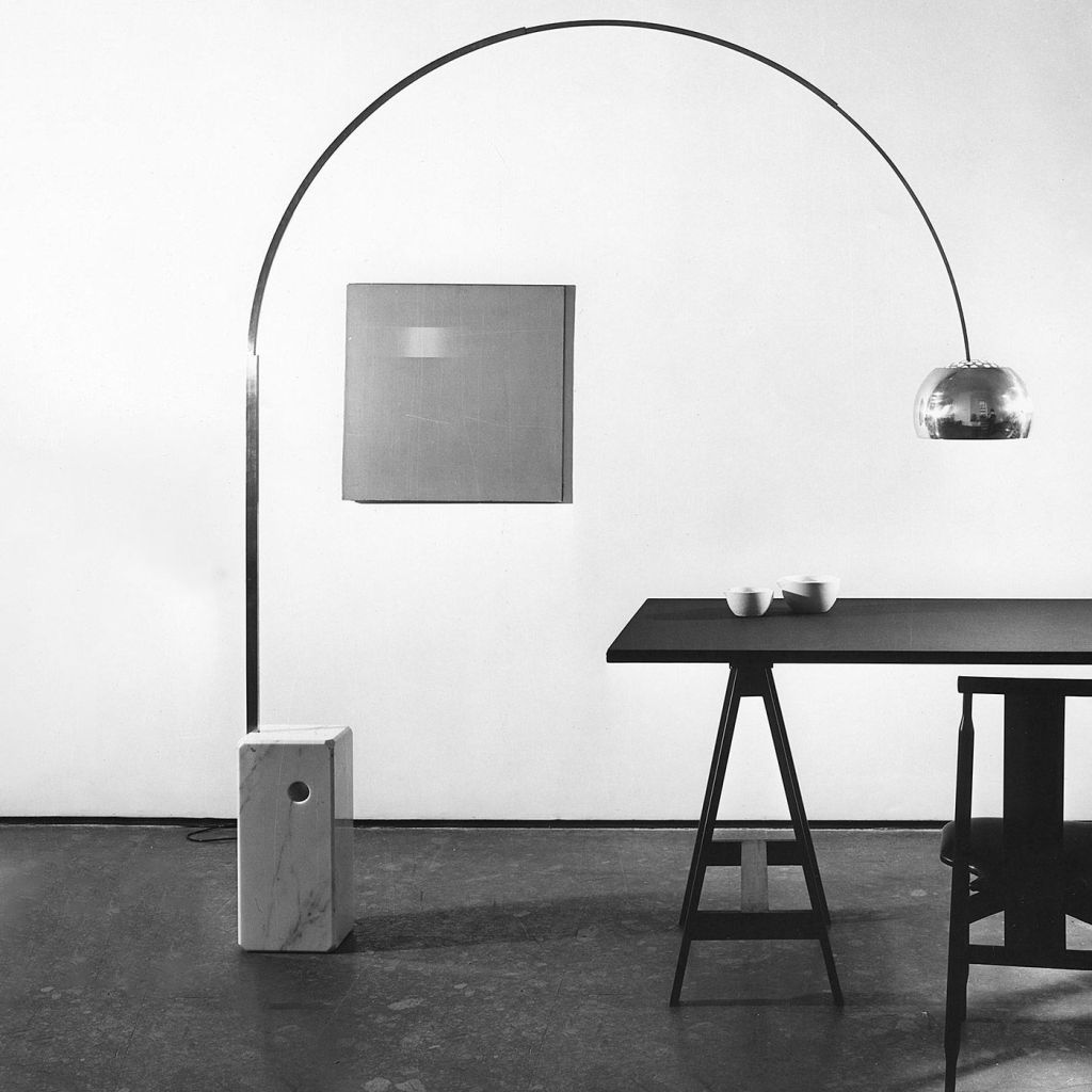 The dining area is close to the kitchen and can be easily expanded to the mid of the space when more visitors come. The standalone Arc lamp dominates the space and ensures that the dining table can be moved freely around the whole room. The open shelves behind the table follow the line of the kitchen working area and optically widen the room.