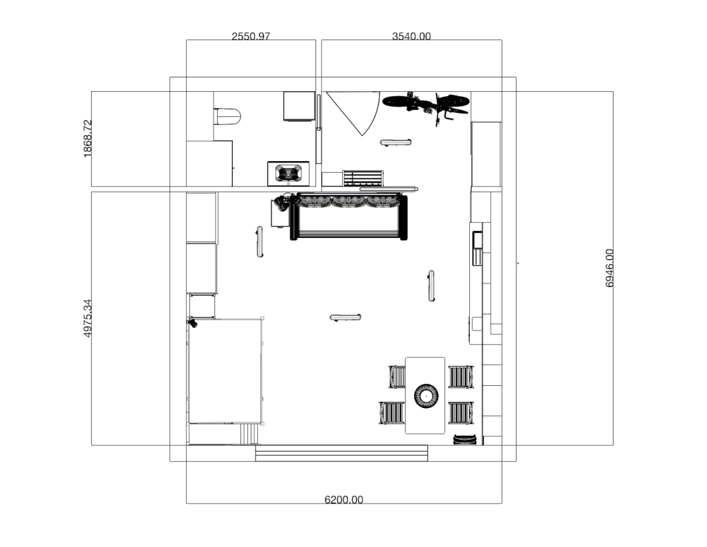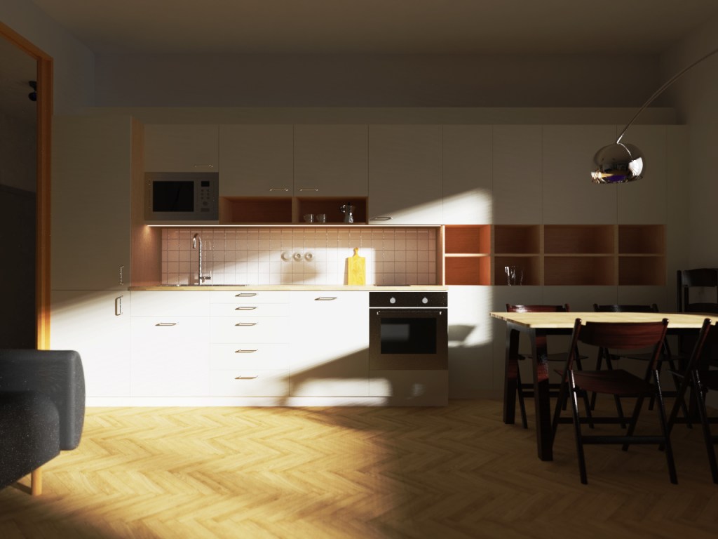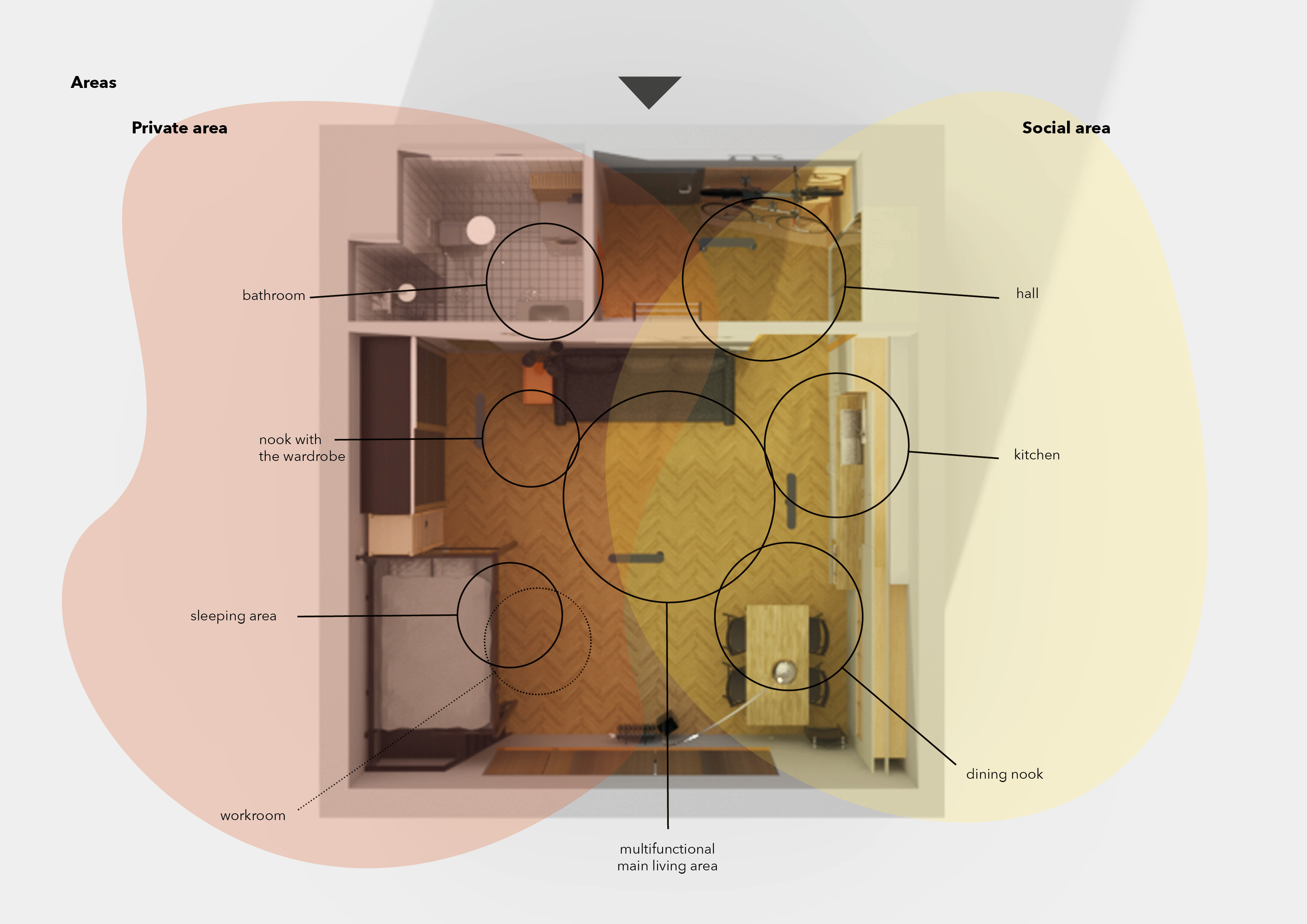 The main living area is on the boundary of social and private zones, so it is easily reachable from every place in the flat. It is left unoccupied so it can be used for exercise, playing board games on the floor, packing for expeditions or a dining area can expand here when hosting a bigger group of people. Sofa id oriented against the window for a nice view and the possibility for sunbathing. a projection screen can be pulled down over the window for occasions of movie nights.