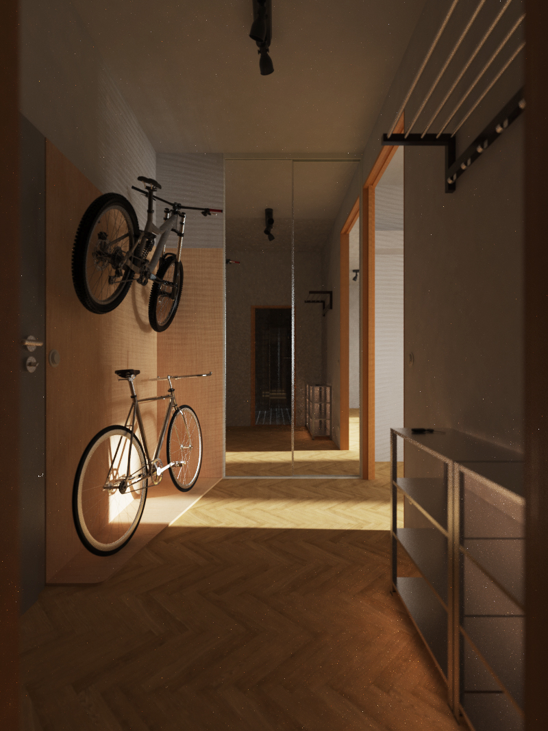 The entrance area is enlarged for easy manipulation with bicycles which have their place right behind the door on the left side. The bike place is defined by sheets of birch plywood that protect the walls and floor from dirt. Its nice natural texture is exposed in the bit of sunlight getting to the hall from the living room. Also, it links the hall to the living room where wood is used.