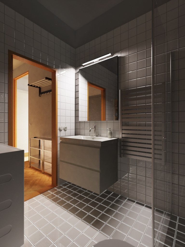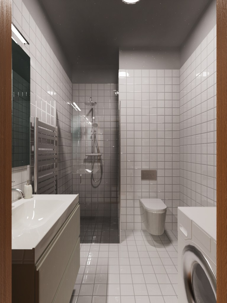 The bathroom is designed in a minimalist way with strong domination of white color. Emphasis is laid on the comfort of use, so the heated towel rack is situated in a comfortable reach from a washbasin as well as in reach of an arm from the shower.