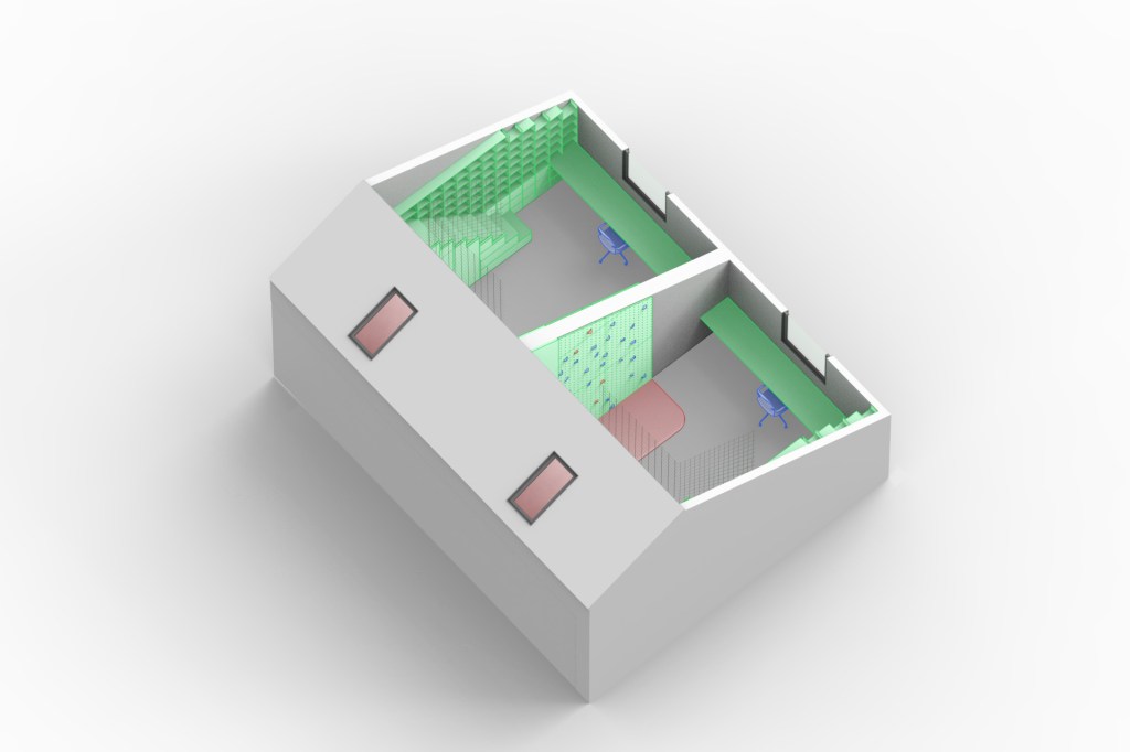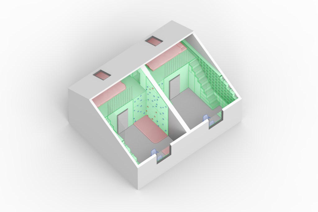 The corner opposite staircase is a universal space designated to change its function easily as the children grow. From the beginning, there could be a slide, later for example pictured climbing wall and anything else furthermore.