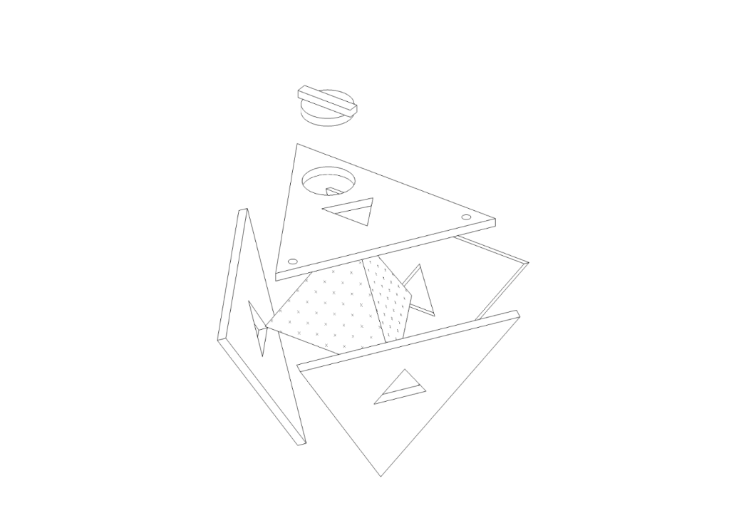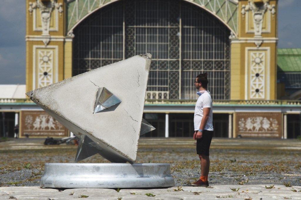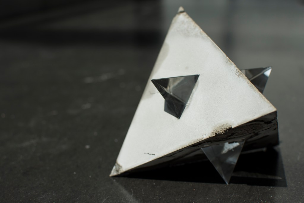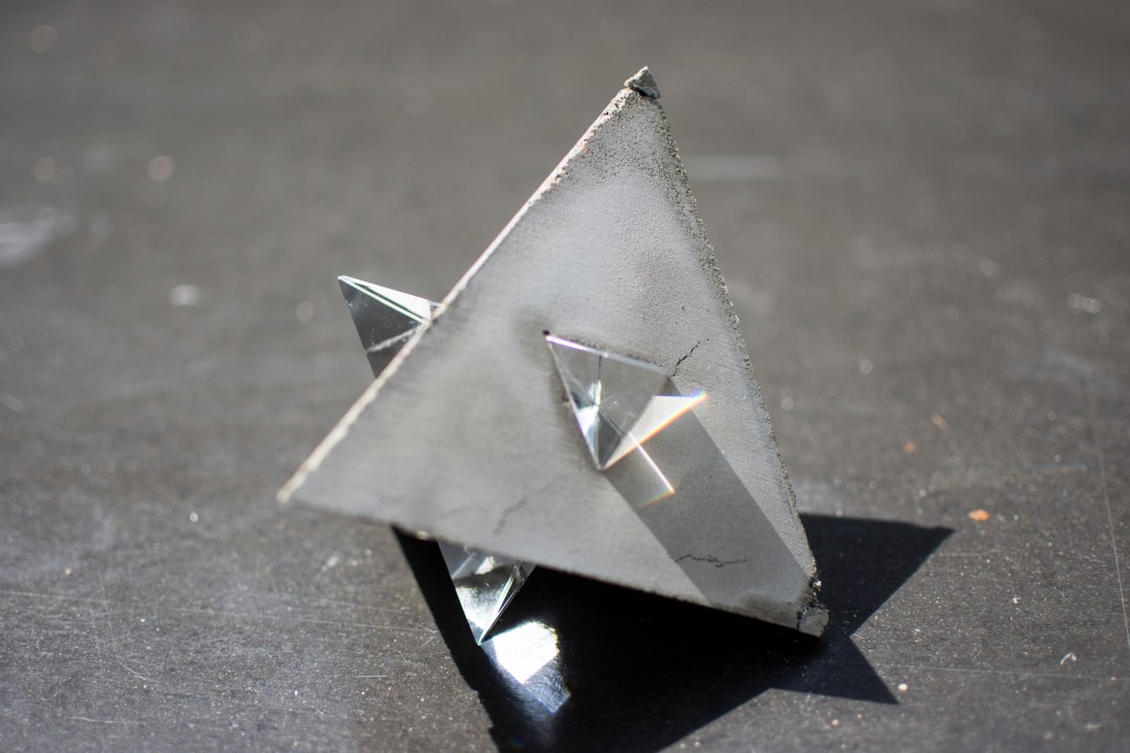 The light is conducted by the glass through the mass of concrete and it is being decomposed. The decomposition together with reflections inside the glass tetrahedron intensifies the role of glass as a gem and attracts the attention of bystanders.