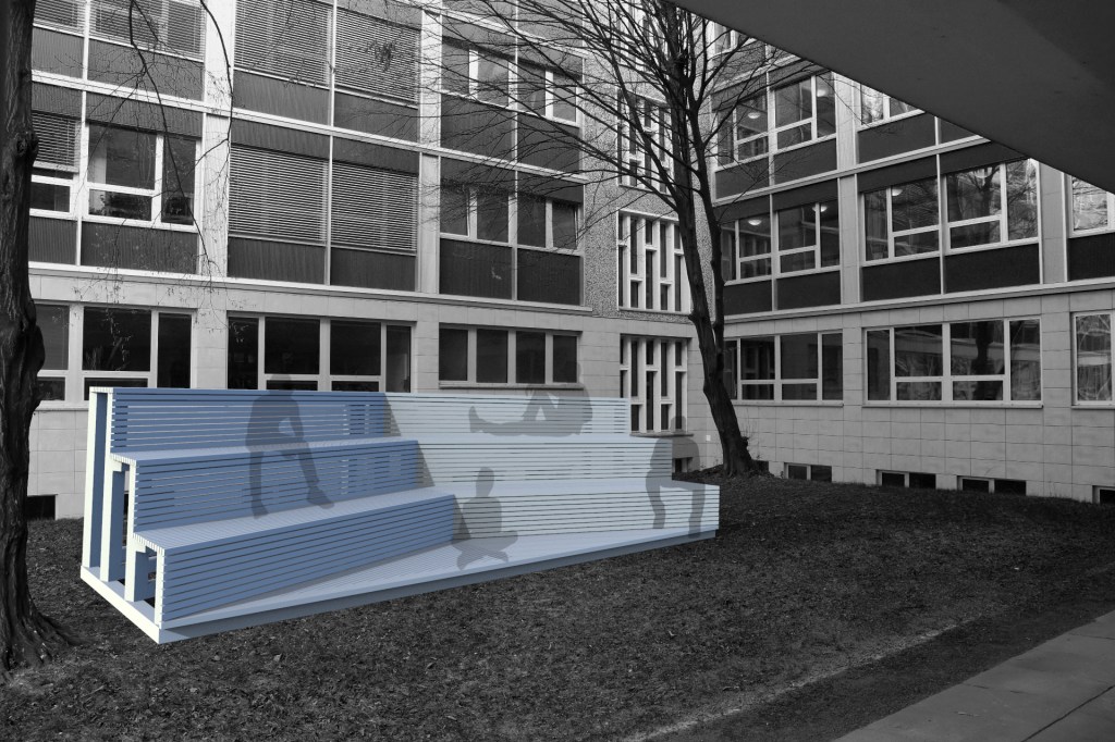 Can be found on the calmest place in the whole street. Surrounding building and trees shield the place form the sun and street noise, which makes it perfect for lectures and discussions. A piece of equipment can be easily brought from the adjacent university building.