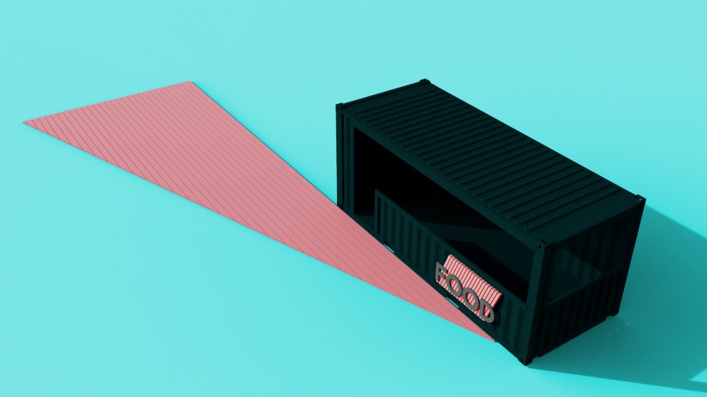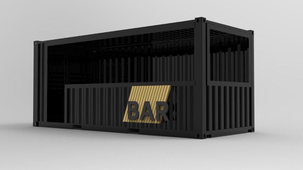 Placed in the centre of the street. The simple black shipping container with unifying sign.