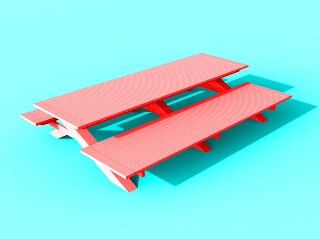 A calm working area is located on a shady half of the street, so it is easy to study and watch a computer screen. The wide desk offers plenty of space for people sitting on both sides of the table. The bench facing the pavement is wide enough so it can be used for people to sit by the table and for others to sit facing the street at the same time.